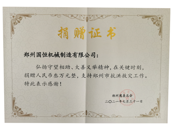 一場千年一遇的大雨,造成整個(gè)城市排水系統(tǒng)癱瘓,因暴雨導(dǎo)致的洪水,造成多地受災(zāi)嚴(yán)重,有人甚至因此失去了生命,為了支援災(zāi)后重建,鄭州國恒機(jī)械設(shè)備制造有限公司,捐款叁萬元整,支持鄭州市抗洪救災(zāi)工作,愿我們守望相助,共渡難關(guān)。
